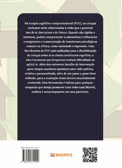 Além dos extremos: baralho de intervenção para crenças nucleares apresenta uma visão prática, criativa e personalizada, além de um passo a passo bem definido, para a condução dessa técnica mundialmente conhecida. Esta ferramenta é valiosa para qualquer terapeuta que deseja promover uma visão mais flexível, realista e autocompassiva em seus pacientes.
