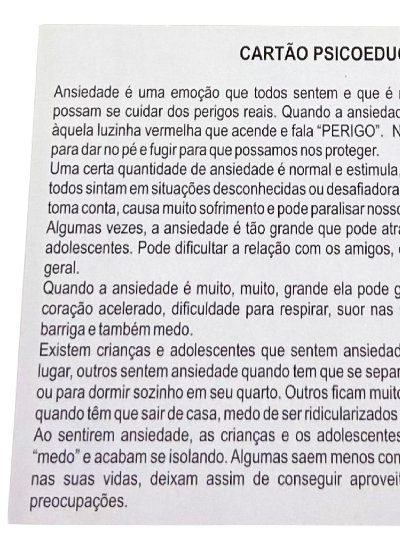 Com o Baralho da ansiedade, crianças e/ou adolescentes são psicoeducados sobre os principais sintomas, dificuldades e comportamentos disfuncionais. Por meio das cartas com sintomas e das cartas com situações, pode-se monitorar os sintomas do paciente de maneira lúdica e interativa, com objetivo de auxiliar o mesmo a lidar com os sintomas de ansiedade.