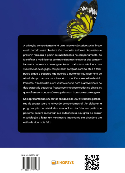 A ativação comportamental é uma intervenção psicossocial breve e estruturada cujos objetivos são combater sintomas depressivos e prevenir recaídas a partir de modificações no comportamento. Ao identificar e modificar as contingências mantenedoras dos comportamentos depressivos ou exagerados (no modo de se relacionar com substâncias, sexo, jogos, computador, compras, comida, etc.), o terapeuta ajuda o paciente não apenas a aumentar seu repertório de atividades prazerosas, mas também a modificar seu estilo de vida. Para isso, este baralho é um valioso recurso para o atendimento de dois grupos de pacientes frequentemente encontrados na clínica: os que sofrem com depressão e aqueles com transtornos do exagero.