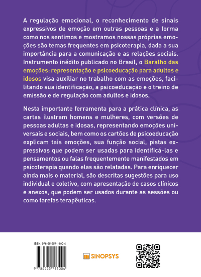 A regulação emocional, o reconhecimento de sinais expressivos de emoção em outras pessoas e a forma como nos sentimos e mostramos nossas próprias emoções são temas frequentes em psicoterapia, dada a sua importância para a comunicação e as relações sociais. Instrumento inédito publicado no Brasil, o Baralho das emoções: representação e psicoeducação para adultos e idosos visa auxiliar no trabalho com as emoções, facilitando sua identificação, a psicoeducação e o treino de emissão e de regulação com adultos e idosos.