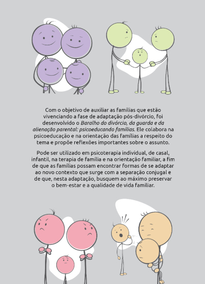 Com o objetivo de auxiliar as famílias que estão vivenciando a fase de adaptação pós-divórcio, foi desenvolvido o Baralho do divórcio, da guarda e da alienação parental: psicoeducando famílias. Ele colabora na psicoeducação e na orientação das famílias a respeito do tema e propõe reflexões importantes sobre o assunto.