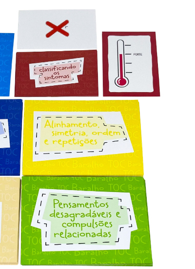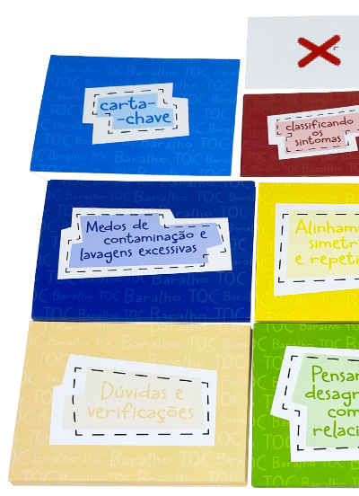 Este Baralho é uma ferramenta para o terapeuta na avaliação, psicoeducação e tratamento de pacientes com Transtorno Obsessivo-compulsivo (TOC). Para auxiliar nesse processo, o material apresenta uma porção de sintomas comumente observados em crianças e adolescentes para que o paciente possa compreender a diversidade dos sintomas, podendo, então, identificar preocupações e comportamentos que possa ter e que nem desconfiava que fossem em função do transtorno.