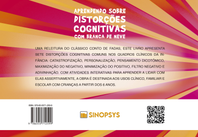 Este livro faz uma releitura do clássico conto da Branca de Neve, apresentando sete distorções cognitivas comuns nos quadros clínicos da infância: catastrofização, personalização, pensamento dicotômico, maximização do negativo, minimização do positivo, filtro negativo e adivinhação.