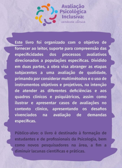 Este livro foi organizado com o objetivo de fornecer ao leitor, suporte para compreensão das especificidades dos processos avaliativos direcionados a populações específicas. Dividido em duas partes, a obra visa abranger as etapas subjacentes a uma avaliação de qualidade, primando por considerar multimétodos e o uso de instrumentos objetivos e projetivos, na intenção de atender as diferentes deficiências e aos quadros clínicos e psiquiátricos, assim como ilustrar e apresentar casos de avaliações no contexto clínico, apresentando os desafios vivenciados na avaliação de demandas específicas.