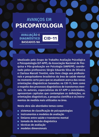 Este livro, organizado pelos professores Sérgio Eduardo Silva de Oliveira e Clarissa Marceli Trentini, reúne destacados autores, todos especialistas do Grupo de Trabalho Avaliação Psicológica e Psicopatologia, da Associação Nacional de Pesquisa e Pós-graduação em Psicologia (ANPEPP), a fim de atualizar os pesquisadores e profissionais brasileiros que trabalham com saúde mental acerca das novas orientações diagnósticas baseadas na CID-11, bem como dos processos diagnósticos de transtornos mentais.