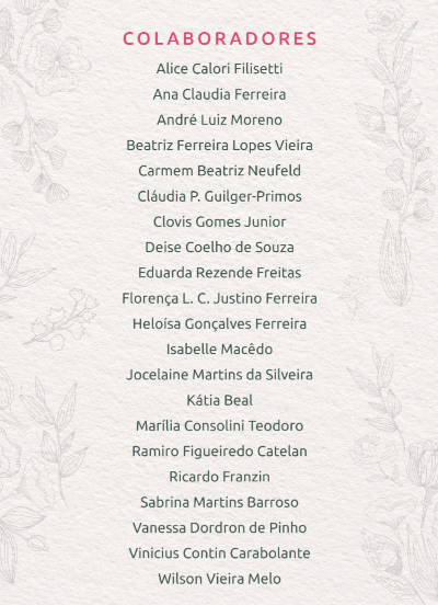 Alice Calori Filisetti, Ana Claudia Ferreira, André Luiz Moreno, Beatriz Ferreira Lopes Vieira, Carmem Beatriz Neufeld, Cláudia P. Guilger-Primos, Clovis Gomes Junior, Deise Coelho de Souza, Eduarda Rezende Freitas, Florença L.C. Justino Ferreira, Isabelle Macêdo, Jocelaine Martins da Silveira, Kátia Beal, Marília Consolini Teodoro, Ramiro Figueiredo Catelan, Ricardo Franzin, Vanessa Dordron de Pinho, Vinicius Contin Carabolante, Wilson Vieira Melo.