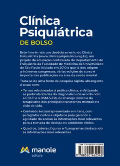 O livro Clínica Psiquiátrica de Bolso foi idealizado para ser uma fonte de pesquisa rápida,abrangente e atual. Nesse formato, procuramos dar prioridade aos temas relacionados diretamente à prática clínica, enfatizando as particularidades do diagnóstico, do manejo clínico e da terapêutica dos principais transtornos mentais no ciclo da vida.