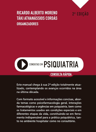 Condutas em psiquiatria: consulta rápida chega à sua 2ª edição totalmente atualizado, contemplando os avanços ocorridos na área na última década. Com formato acessível e informações concisas, aborda temas como psicofarmacologia geral, interações farmacológicas e urgências em psiquiatria, bem como os tratamentos usados em condições especiais e em diferentes etapas da vida, constituindo-se em ferramenta indispensável para a prática psiquiátrica, tanto no ambiente hospitalar como no consultório.