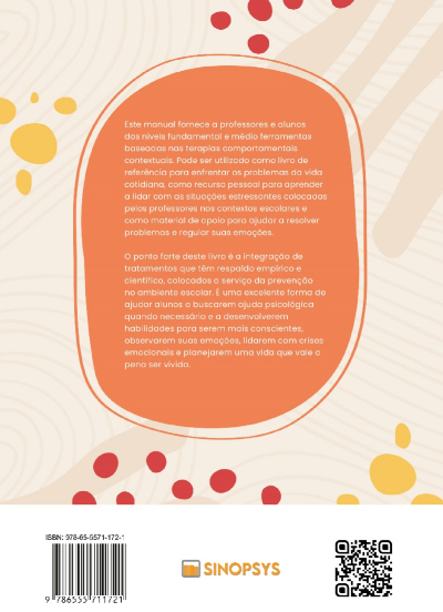 Este manual fornece a professores e alunos dos níveis fundamental e médio ferramentas baseadas nas terapias comportamentais contextuais. Pode ser utilizado como livro de referência para enfrentar os problemas da vida cotidiana, como recurso pessoal para aprender a lidar com as situações estressantes colocadas pelos professores nos contextos escolares e como material de apoio para ajudar a resolver problemas e regular suas emoções.