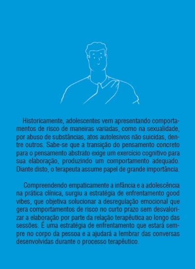 Compreendendo empaticamente a infância e a adolescência na prática clínica, surgiu a estratégia de enfrentamento good vibes, que objetiva solucionar a desregulação emocional que gera comportamentos de risco no curto prazo sem desvalorizar a elaboração por parte da relação terapêutica ao longo das sessões. É uma estratégia de enfrentamento que estará sempre no corpo da pessoa e a ajudará a lembrar das conversas desenvolvidas durante o processo terapêutico.