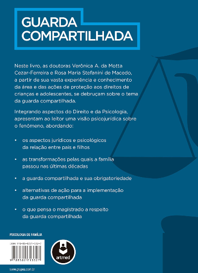 Integrando aspectos do Direito e da Psicologia, apresentam ao leitor uma visão psicojurídica sobre o fenômeno, abordando: os aspectos jurídicos e psicológicos da relação entre pais e filhos; as transformações pelas quais a família passou nas últimas décadas; a guarda compartilhada e sua obrigatoriedade; ações possíveis para a implementação da guarda compartilhada; o que pensa o magistrado a respeito da guarda compartilhada.