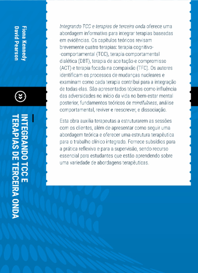 Integrando TCC e terapias de terceira onda oferece uma abordagem informativa para integrar terapias baseadas em evidências. Os capítulos teóricos revisam brevemente quatro terapias: terapia cognitivo-comportamental (TCC), terapia comportamental dialética (DBT), terapia de aceitação e compromisso (ACT) e terapia focada na compaixão (TFC). Os autores identificam os processos de mudanças nucleares e examinam como cada terapia contribui para a integração de todas elas. São apresentados tópicos como influência das adversidades no início da vida no bem-estar mental posterior, fundamentos teóricos de mindfulness, análise comportamental, reviver e reescrever, e dissociação.