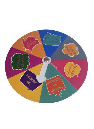 Elaborada para que, de forma lúdica e criativa, o terapeuta possa acessar, monitorar e trabalhar os pensamentos e distorções cognitivas. Pensamentos da roda: Pensamentos bons, pensamentos que confundem, pensamentos que ajudam, pensamentos que dão medo, pensamentos que atrapalham, pensamentos ruins e pensamentos que paralisam.