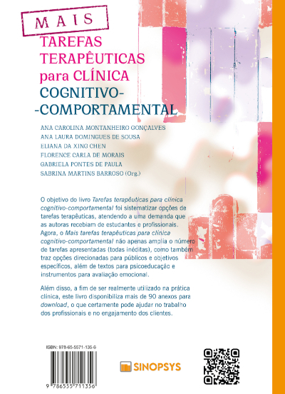 O objetivo do livro Tarefas terapêuticas para clínica cognitivo-comportamental foi sistematizar opções de tarefas terapêuticas, atendendo à demanda que as autoras recebiam de estagiárias e profissionais em atendimentos clínicos. Agora, neste livro, além de serem mais tarefas terapêuticas, estas são direcionadas a públicos mais específicos: há opções de ferramentas para trabalhar com grupos, com pessoas com transtornos especificados e com aquelas em intervenções com objetivos mais delimitados.
