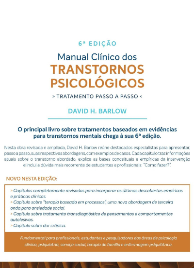 Este livro apresenta, passo a passo e com exemplos, os diferentes tratamentos psicológicos para transtornos mentais. Sob a organização do dr. David H. Barlow, os autores reúnem informações atuais sobre os transtornos abordados, explicam as bases conceituais e empíricas da intervenção e buscam responder à pergunta mais frequentemente feita por estudantes e profissionais: “Como fazer?”. Além de abordar os transtornos mais comumente observados em adultos, esta edição traz três capítulos novos: um capítulo sobre a terapia baseada em processos, uma nova abordagem de terceira onda para ansiedade social, um capítulo sobre tratamento transdiagnóstico de pensamentos e comportamentos autolesivos e um capítulo sobre dor crônica.