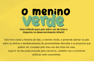 A história de Dan, o menino verde, se propõe a ser um recurso para utilização em contextos clínico e familiar direcionado aos adultos. Pretende provocar a reflexão e a conscientização de pais ou outros cuidadores, chamando a atenção para os efeitos da parentalidade distraída, conceito que descreve os prejuízos da parentalidade permeada pelo uso de telas.