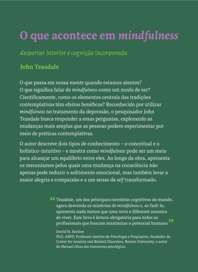 Reconhecido por utilizar mindfulness no tratamento da depressão, o pesquisador John Teasdale busca responder a essas perguntas, explorando as mudanças mais amplas que as pessoas podem experimentar por meio de práticas contemplativas.O autor descreve dois tipos de conhecimento – o conceitual e o holístico-intuitivo – e mostra como mindfulness pode ser um meio para alcançar um equilíbrio entre eles. Ao longo da obra, apresenta os mecanismos pelos quais uma mudança na consciência não apenas pode reduzir o sofrimento emocional, mas também levar a maior alegria e compaixão e a um senso de self transformado.
