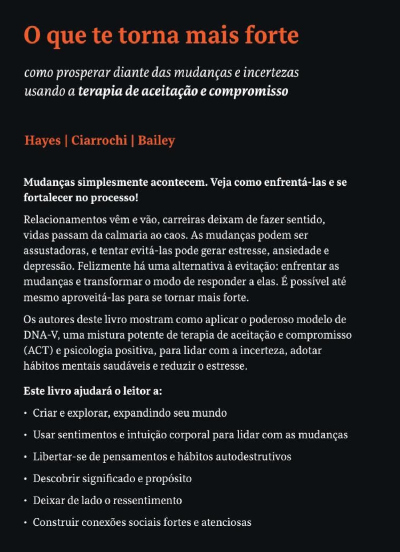 Em O que te torna mais forte, Louise L. Hayes, Joseph V. Ciarrochi e Ann Bailey mostram como aplicar o poderoso modelo de DNA-V, uma mistura potente de terapia de aceitação e compromisso (ACT) e psicologia positiva, para lidar com a incerteza, adotar hábitos mentais saudáveis e reduzir o estresse enfrentando as mudanças e transformando o modo de responder a elas.
