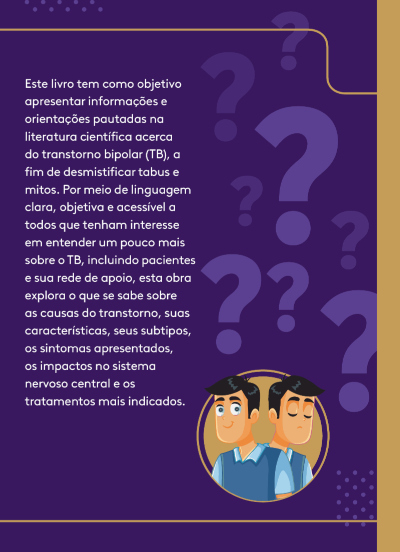 Este livro tem como objetivo apresentar informações e orientações pautadas na literatura científica acerca do transtorno bipolar (TB), a fim de desmitificar tabus e mitos. Por meio de linguagem clara, objetiva e acessível a todos que tenham interesse em entender um pouco mais sobre o TB, incluindo pacientes e sua rede de apoio, esta obra explora o que se sabe sobre as causas do transtorno, suas características, seus subtipos, os sintomas apresentados, os impactos no sistema nervoso central e os tratamentos mais indicados.