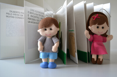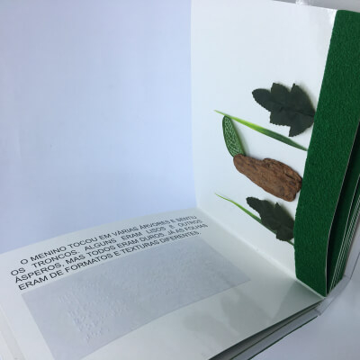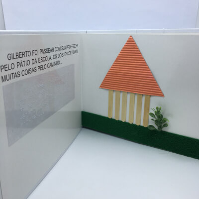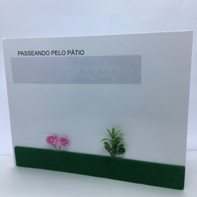 Acessível a pessoas de todas as idades (com ou sem alguma deficiência) que tenham interesse em ler, o livro conta uma história do cotidiano infantil com personagens que conduzem o leitor a explorar os elementos encontrados em um passeio pelo pátio da escola. Além da escrita em português impressa em tamanho de fonte ampliado, para pessoas com baixa visão, disponibiliza o braile, para quem nada enxerga ou dele faz uso. No lugar das ilustrações em tinta, traz elementos mais próximos dos reais para serem tocados.