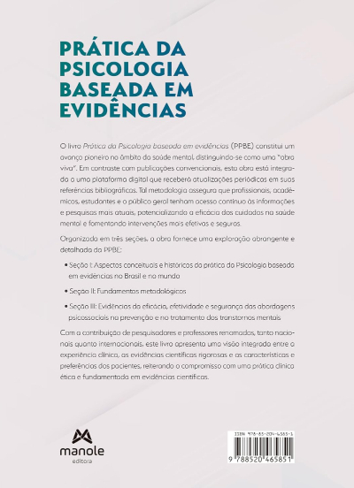 O livro Prática da Psicologia baseada em evidências (PPBE) constitui um avanço pioneiro no âmbito da Saúde Mental, distinguindo-se como uma “obra viva”. Em contraste com publicações convencionais, esta obra está integrada a uma plataforma digital que receberá atualizações periódicas em suas referências bibliográficas. Tal metodologia assegura que profissionais, acadêmicos, estudantes e o público geral tenham acesso contínuo às informações e pesquisas mais atuais, potencializando a eficácia dos cuidados na saúde mental e fomentando intervenções mais efetivas e seguras.