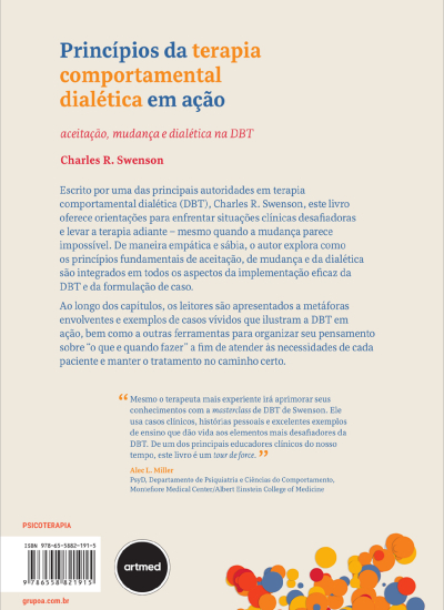 Ao longo dos capítulos, os leitores são apresentados a metáforas envolventes e exemplos de casos vívidos que ilustram a DBT em ação, bem como a outras ferramentas para organizar seu pensamento sobre “o que e quando fazer” a fim de atender às necessidades de cada paciente e manter o tratamento no caminho certo.