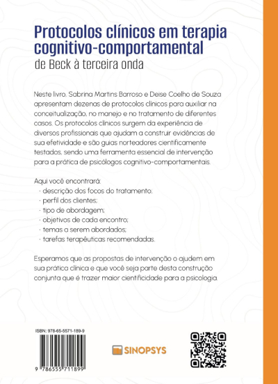 O livro apresenta diversos protocolos nacionais e internacionais com base nas abordagens clássica e de terceira onda da terapia cognitivo-comportamental, separando-os por tipo de atendimento (individual ou em grupo) e diferenciando as propostas presenciais daquelas desenvolvidas para atendimento on-line ou misto.