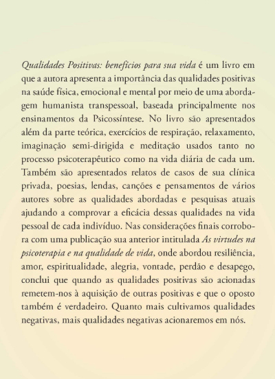Em Qualidades Positivas: benefícios para sua vida a autora, Marina Pereira Rojas Boccalandro, experiente psicóloga clínica e psicoterapeuta busca demonstrar o quanto as qualidades e os sentimentos positivos podem trazer benefícios para a vida das pessoas.