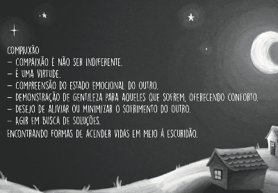 Este é um material reflexivo sobre a temática da compaixão, que é a capacidade de compreender o estado emocional do outro e não demonstrar indiferença, mas sim gentileza. É oferecer conforto e ter o desejo de aliviar ou minimizar o sofrimento do outro, de agir em busca de soluções. Compaixão é encontrar formas de acender vidas em meio à escuridão.