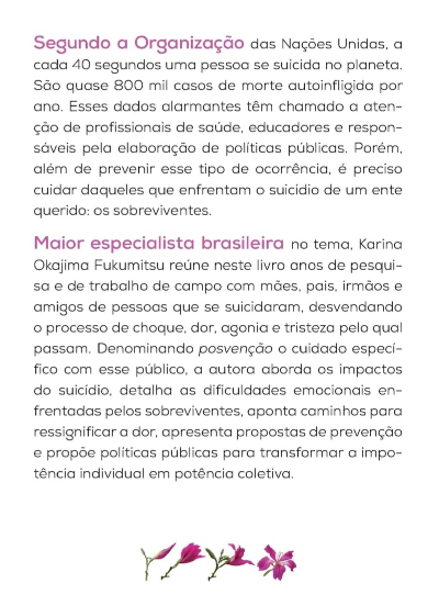 Maior especialista brasileira no tema, Karina Okajima Fukumitsu reúne neste livro anos de pesquisa e de trabalho de campo com mães, pais, irmãos e amigos de pessoas que se suicidaram, desvendando o processo de choque, dor, agonia e tristeza pelo qual passam. Denominando posvenção o cuidado específico com esse público, a autora aborda os impactos do suicídio, detalha as dificuldades emocionais enfrentadas pelos sobreviventes, aponta caminhos para ressignificar a dor, apresenta propostas de prevenção e propõe políticas públicas para transformar a impotência individual em potência coletiva.