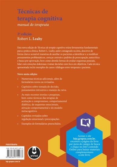 Esta nova edição de Técnicas de Terapia Cognitiva reúne ferramentas fundamentais para a prática clínica. Robert L. Leahy, autor consagrado na área, descreve de forma clara e acessível maneiras de auxiliar os pacientes a identificar e a modificar pensamentos problemáticos, crenças centrais e padrões de preocupação, autocrítica e busca por aprovação, bem como aborda como avaliar esquemas pessoais, lidar com emoções dolorosas e tomar decisões com foco em objetivos. Cada técnica de terapia cognitiva apresentada inclui exemplos de casos e diálogos entre terapeuta e paciente.