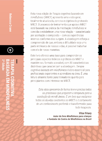 Este livro oferece uma base para compreender os principais aspectos teóricos e práticos do MBCT e mantém seu formato acessível, com 30 características distintivas que caracterizam a abordagem. Terapia cognitiva baseada em mindfulness é obra essencial para profissionais experientes e aprendizes na área. É uma leitura atraente tanto para treinadores quanto para principiantes com interesse no MBCT.