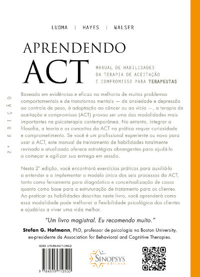 Nesta 2ª edição, você encontrará exercícios práticos para ajudá-lo a entender e a implementar o modelo único dos seis processos da ACT, tanto como ferramenta para diagnóstico e conceitualização de casos quanto como base para a estruturação de tratamento para os clientes. Ao praticar as habilidades descritas neste livro, você aprenderá como essa modalidade pode melhorar a flexibilidade psicológica dos clientes e ajudá-los a viver uma vida melhor.