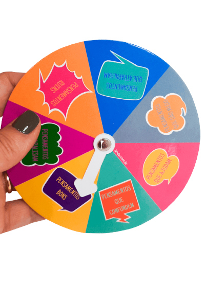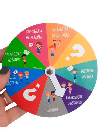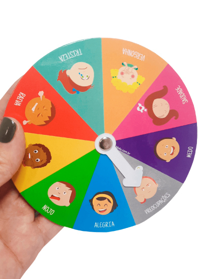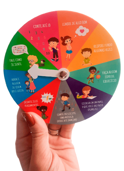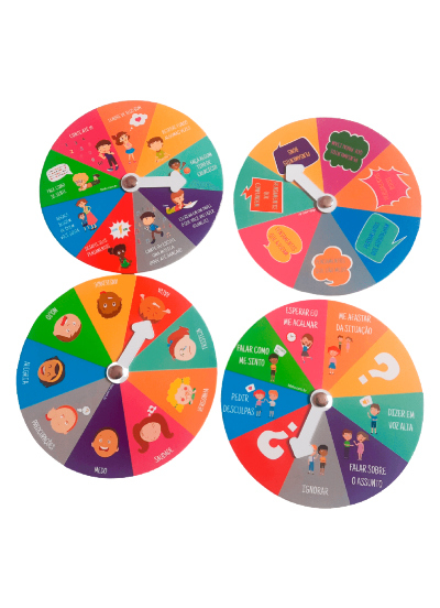 Este kit contém 4 rodas: Roda das emoções; Roda dos pensamentos; Roda da resolução de conflitos; e, Roda de controle de ansiedade.