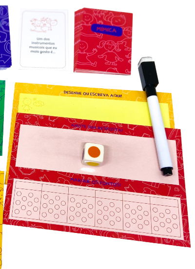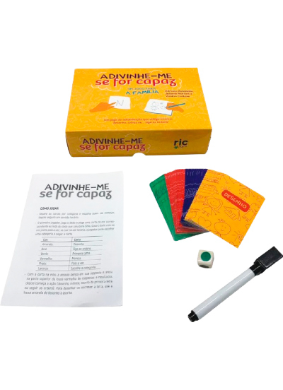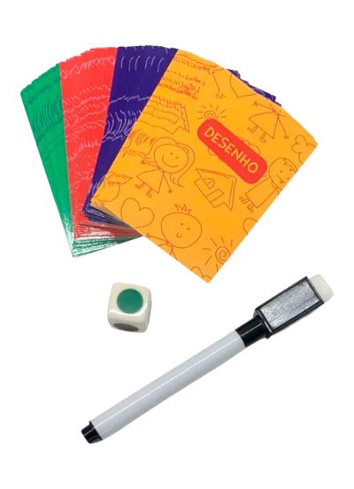 Contém: 80 cartas, 2 lousas, 1 dado e 1 caneta.