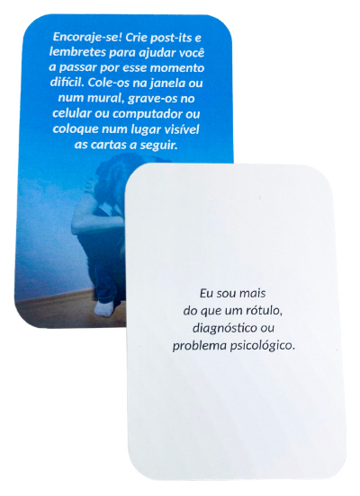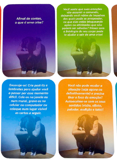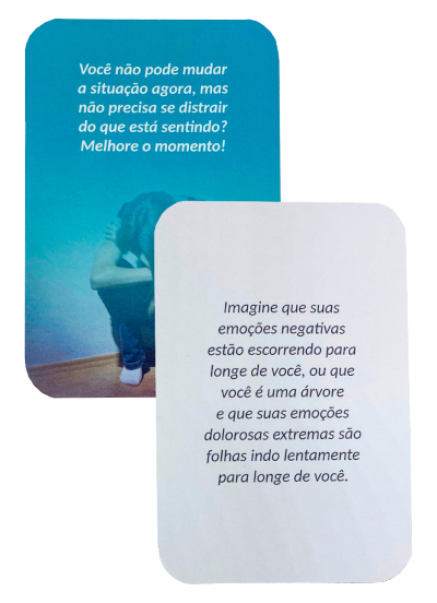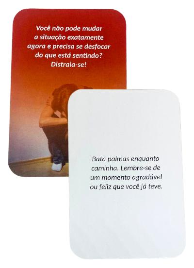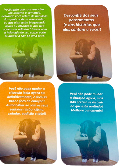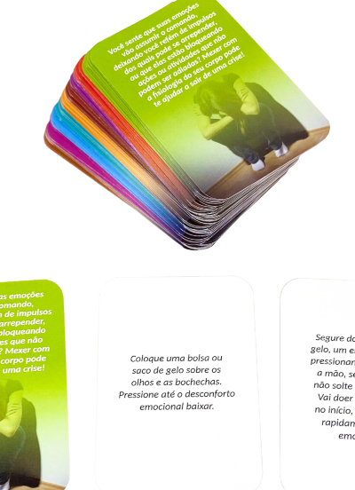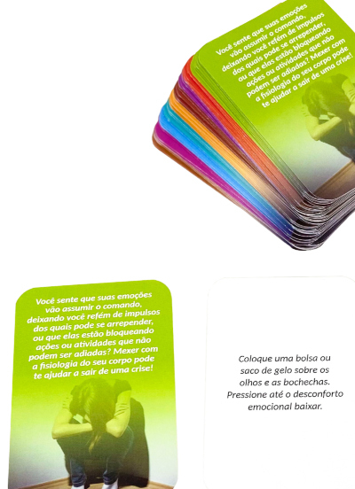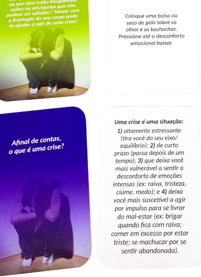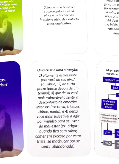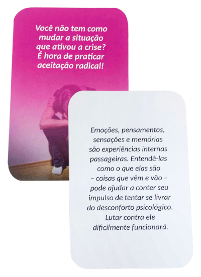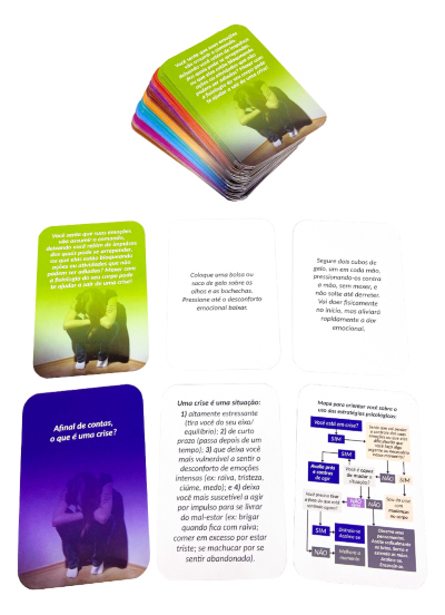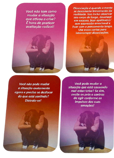 A proposta desses cards é servirem como recurso de autoajuda para lidar com sofrimento intenso e crises decorrentes de transtornos de desregulação emocional, mas não se limita a isso. O conteúdo é autoinstrutivo e focado em sugestões de manejo, recomendações clínicas e frases de estímulo/apoio amplamente baseados em evidências da Terapia Comportamental Dialética. O material direciona-se ao público geral, pacientes/população clínica e para profissionais indicarem para pacientes, praticarem psicoeducação e aplicação em consultório.