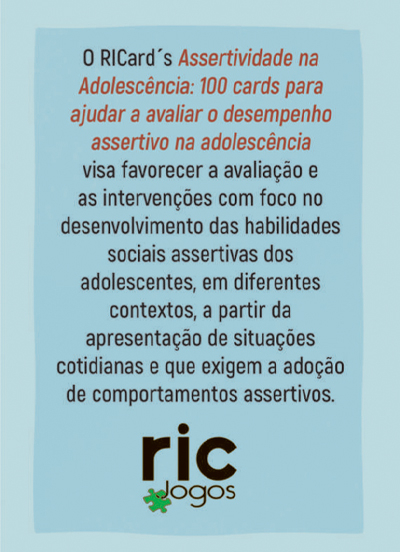 É um material psicoeducativo para o contexto clínico, com adolescentes. Em cada card, há uma expressão de bem-querer que estimula reflexões e mudanças comportamentais e cognitivas e auxilia você a se capacitar no manejo das emoções, a se autoconhecer e a fazer autorreflexões.
