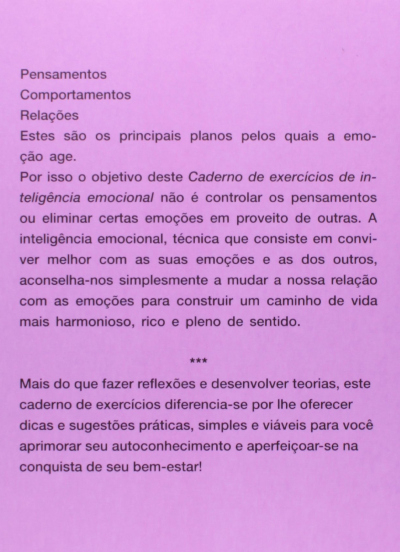 O objetivo desse caderno de inteligência emocional não é controlar os pensamentos ou eliminar certas emoções em proveito de outras. A inteligência emocional, técnica que consiste em conviver melhor com as suas emoções e as dos outros, aconselha-nos simplesmente a mudar a nossa relação com as emoções para construir um caminho de vida mais harmonioso, rico e pleno de sentido.