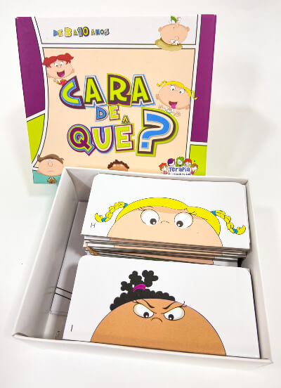 Cara de quê? é um material lúdico-terapêutico que propõe de forma divertida a aprendizagem do reconhecimento de emoções e sentimentos pelas crianças a partir de expressões faciais.
