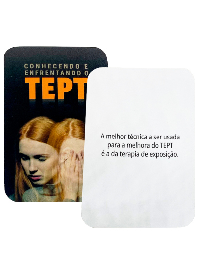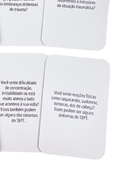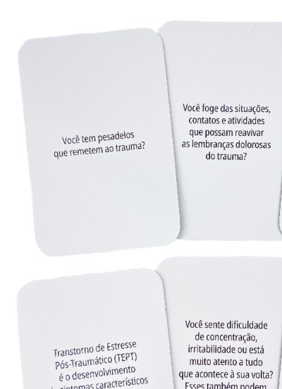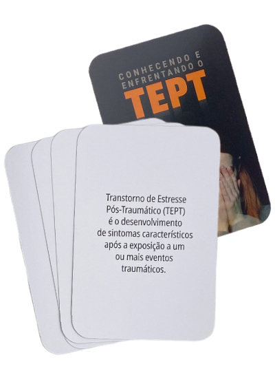 O Transtorno de Estresse Pós-traumático (TEPT) se caracteriza pela dificuldade que uma pessoa enfrenta na recuperação após um evento que envolva perigo iminente à vida: seja vivenciando-o, testemunhando-o ou tomando conhecimento de que ocorreu com algum membro da família ou amigo próximo. Estes cards irão ajudar você a conhecer melhor este transtorno, a identificar se possui algum indício de TEPT, encorajando-o na busca de ajuda especializada.