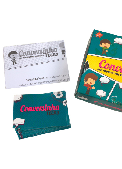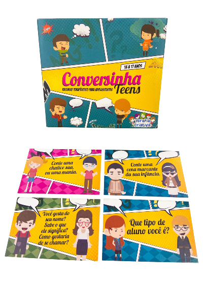 Conversinha Teens é um recurso para uso nas primeiras sessões de psicoterapia com adolescentes. Útil para adolescentes que não verbalizam espontaneamente seus problemas ou que precisam ser introduzidos à linguagem e aos assuntos de interesse da psicoterapia, como por exemplo, falar de problemas e expressar seus pontos de vista de forma tranquila.