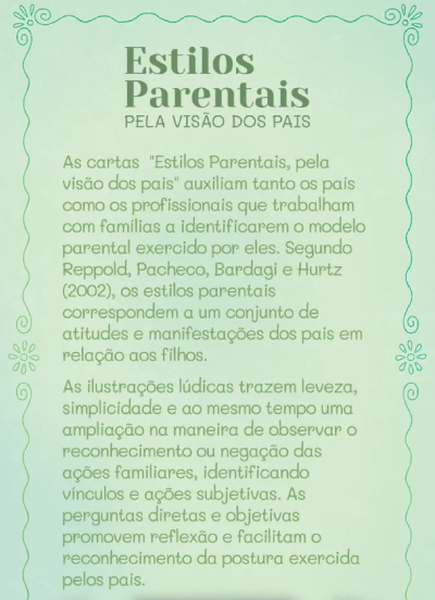 O livro-caixinha possui 50 cartas que provocam reflexões na relação parental que exerce ou pretende exercer em relação ao seu filho(a). Uma obra que também permite pensar nas práticas educativas, vínculo e conscientização dessa relação parental, favorecendo o autoconhecimento de sua parentalidade.