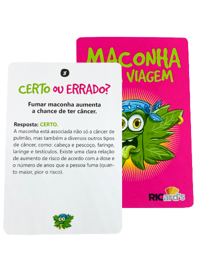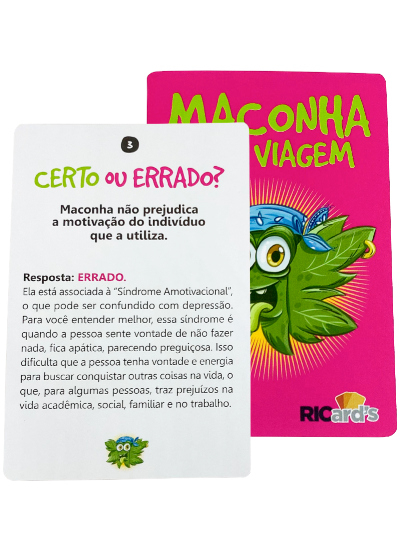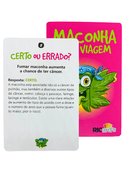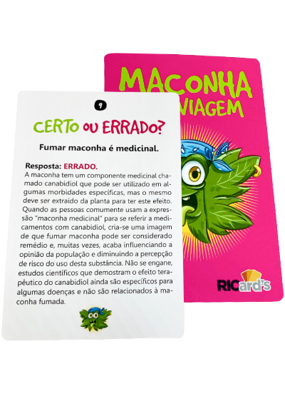 Maconha sem Viagem tem o objetivo de fornecer informações científicas a respeito da maconha para adultos, adolescentes e para familiares de usuários dessa substância. Esse jogo terapêutico pode ser jogado individualmente ou em grupo, nas famílias, com ou sem a presença de um terapeuta. Ricard`s da maconha sem viagem tem uma linguagem simples e informa, de modo lúdico e divertido, quanto às características da maconha, seus efeitos, benefícios e prejuízos, desfazendo ideias erradas e preconceituosas que são frequentemente divulgadas nos meios de comunicação.