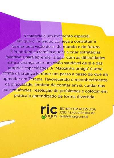 A Mãozinha Amiga - Como ajudar a criança a lidar com as dificuldades sociais compõe a série de três recursos da Ric Jogos baseados na terapia cognitivo-comportamental: Coração gigante, mãozinha amiga e pé de apoio.