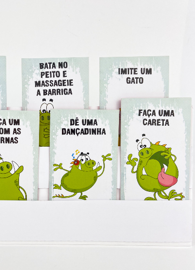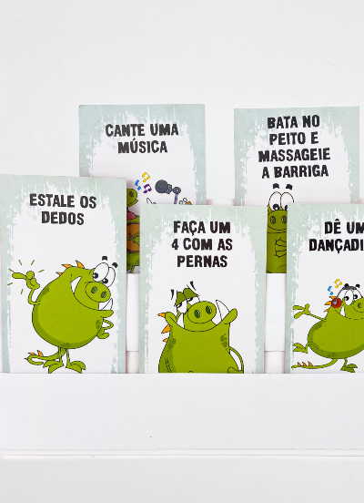 Jogo de mímicas para promover a diminuição nas respostas fisiológicas características de ansiedade oriundas da autoexposição. Tarefas diferentes e divertidas para se soltar, rir e relaxar podem ajudar crianças muito tensas ou muito retraídas a prestarem atenção ao próprio corpo, usarem a imaginação e a criatividade, e não se preocuparem com julgamentos externos de adequação ou inadequação. Ajuda também as impulsivas a se controlarem, refrearem um comportamento para emitirem outro na sequência de desafios da brincadeira.