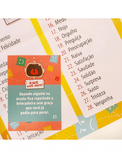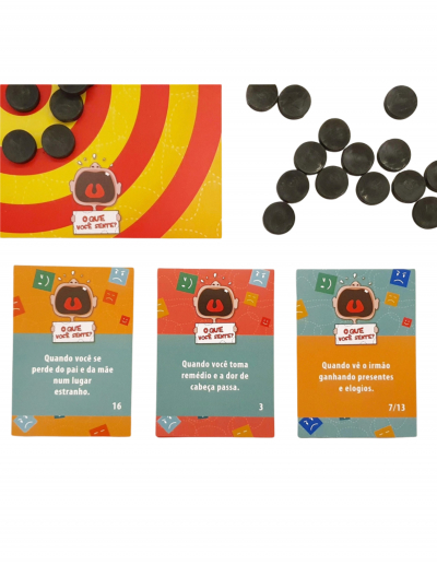 O que você sente quando mudam as regras no meio da brincadeira? E quando o pai ou a mãe não te deixam usar o computador? O que você sente quando você ganha o cachorrinho que tanto queria? O que você sente? é um jogo para trabalhar com crianças o reconhecimento das próprias emoções e sentimentos expondo-a a situações imaginárias, mas que poderiam acontecer no seu cotidiano. Identificar as emoções evocadas por diferentes eventos do ambiente antecede a aprendizagem do enfrentamento dos problemas clínicos.