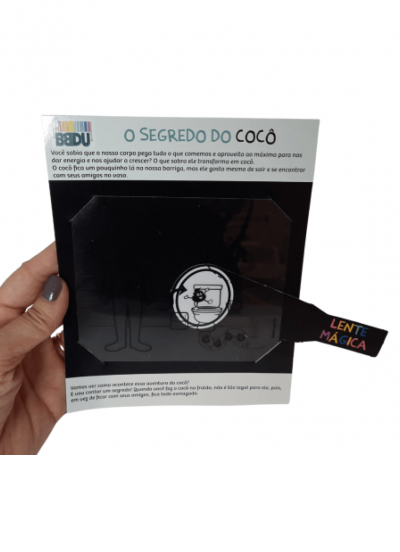 Contém: Uma "lente mágica" em papel cartão destacável que, ao passar por baixo da lâmina, dá a impressão de iluminar (mostrar) as imagens que explicam o segredo do cocô.