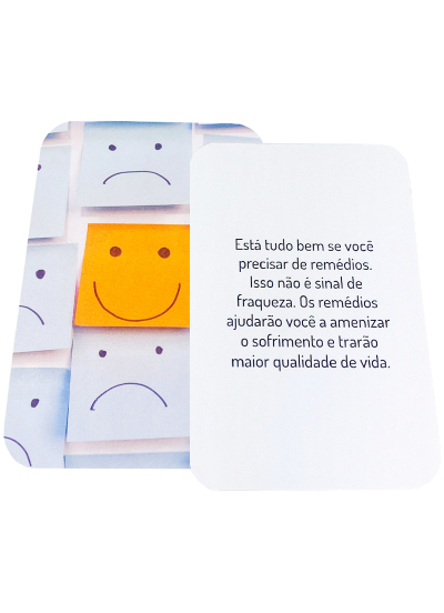A proposta dos cards é servir como recurso de autoajuda baseada em evidências científicas para lidar com sintomas associados à depressão e humor deprimido. O conteúdo é autoinstrutivo. São oferecidas estratégias de manejo, frases de estímulo e técnicas para lidar melhor com os sintomas. O material é especialmente útil tanto para pessoas com os sintomas quanto para os familiares. Ele serve também de uso para profissionais realizarem psicoeducação sobre os sintomas.